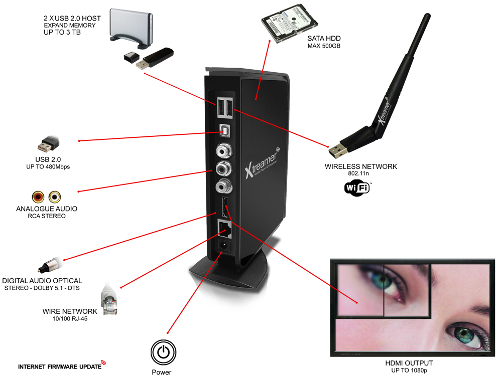 De Xtreamer meet 180x32x82mm en wordt zonder harddisk geleverd, maar de gebruiker kan een 2,5"-sata-schijf van maximaal 500GB in de behuizing plaatsen. Daarnaast kan content gestreamed worden via de ethernetaansluiting en kan afgespeeld worden vanaf apparaten die op de twee usb 2.0-aansluitingen aangesloten zijn. Ook is het mogelijk om een 802.11n wifi-module in een van de usb-ingangen te prikken. De harddisk in het apparaat kan ook extern benaderd worden via de extra usb-slave-aansluiting.