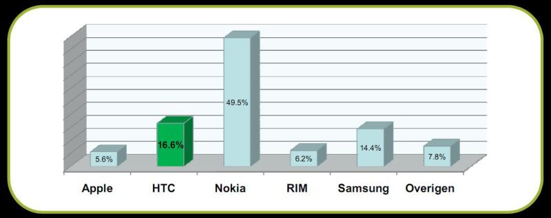 Nokia is nog steeds ruimschoots de marktleider in het segment van de 'smart mobile devices', zoals smartphones worden genoemd in het rapport van het onderzoeksbureau Canalys, dat per land de verkoop van smartphones bijhoudt. Bijna de helft van de toestellen die in 2008 in Nederland werden verkocht, was van Finse makelij. HTC is de nummer twee, met een marktaandeel van 16,6 procent. Samsung staat op plaats drie: de Koreaanse fabrikant heeft 14,4 procent van de Nederlandse markt in handen.