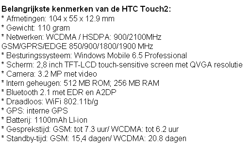 HTC heeft zijn eerste smartphone gepresenteerd die vanaf de release met Windows Mobile 6.5 geleverd wordt. De HTC Touch2 is een budgettoestel voorzien van de aloude 528MHz-cpu en een 2,8"-touchscreen met een resolutie van 240x320 pixels.