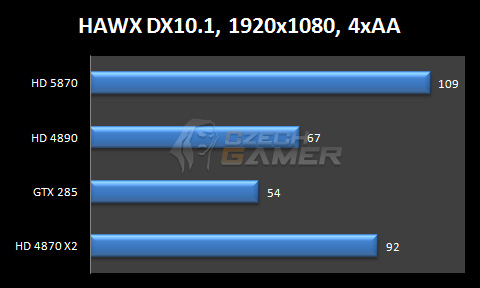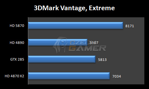 Het eerste spel dat getest werd, is Tom Clancy's H.A.W.X., waarin de HD 5870 de videokaarten van de oudere generatie met gemak achter zich laat. De videokaart weet zelfs de HD 4870X2 voor te blijven. De tweede benchmark betreft 3DMark Vantage met de Extreme-instelling. Deze benchmark is minder veelzeggend, maar valt nog steeds ruimschoots uit in het voordeel van de HD 5870. De eerste resultaten lijken in lijn te liggen met de specificaties die eerder naar buiten kwamen.