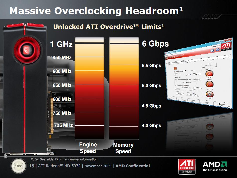 Ondanks de lagere kloksnelheden claimt AMD een zeer hoog overklokpotentieel. Om gebruik te kunnen maken van dat potentieel heeft AMD de maximum-kloksnelheden in ATI CCC opgehoogd naar 1000MHz en 6000MHz voor respectievelijk de gpu en het geheugen. Net zoals bij de HD 5870 worden de gpu's aangestuurd door Volterra-chips die met behulp van software afgeregeld kunnen worden, opdat bijvoorbeeld de spanning verhoogd kan worden.