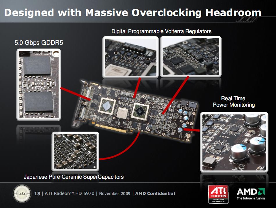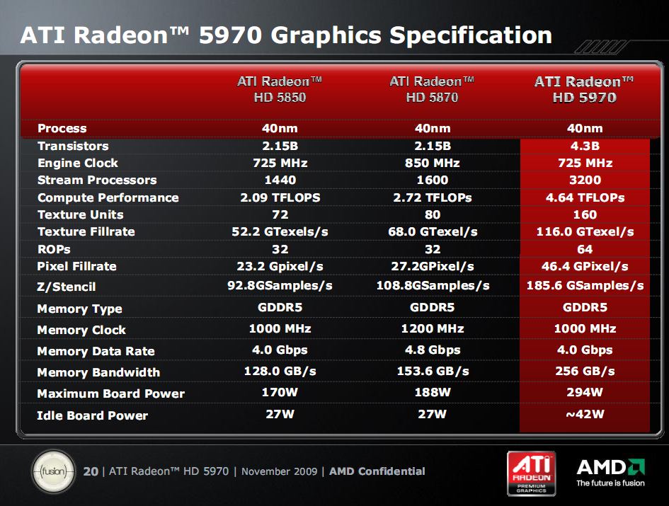 De HD 5970, zoals de videokaart gaat heten, heeft twee volledig functionele Cypress-gpu's aan boord. Dat houdt in dat de gpu's elk over 1600 streamprocessors kunnen beschikken en met een 256bit-geheugenbus het gddr5-geheugen aanspreken. Volgens de slides zijn de gpu's op 725MHz geklokt terwijl het gddr5-geheugen, waarvan beide gpu's over 1GB beschikken, op 4000MHz loopt. Zowel de gpu's als het geheugen zijn daarmee lager geklokt dan op een HD 5870, waarmee de tdp, die uiteindelijk 294W bedraagt, onder de 300W kon blijven. Het idle-verbruik zou met 42W een stuk lager liggen.