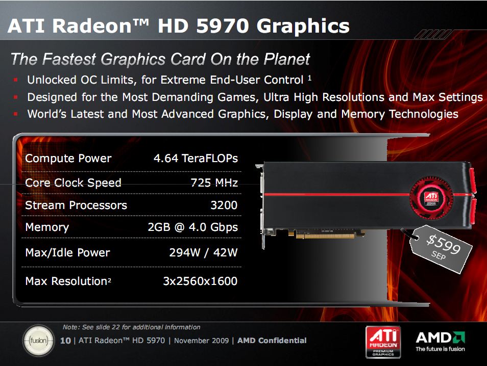 Er zijn enkele marketingslides van AMD opgedoken met details over de binnenkort uit te brengen HD 5970, AMD's nieuwe vlaggenschip. De tdp zou nog net geen 300W bedragen, terwijl al die warmte door een vapor chamber wordt afgevoerd.