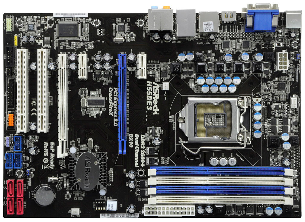 Twee van de Asrock-moederborden zijn in micro-atx-formaat uitgevoerd; de derde is een atx-bord met reguliere afmetingen. Het meest eenvoudige micro-atx-bord, de H55M, is van slechts twee ddr3-slots voorzien en heeft twee pcie-x16-slots, een x1-slot en een pci-sleuf. Video-output van de Clarkdale-igp wordt via een D-sub-, dvi- of hdmi-poort aan een display aangeboden. Het moederbord beschikt over vier sata- en twee esata-poorten.