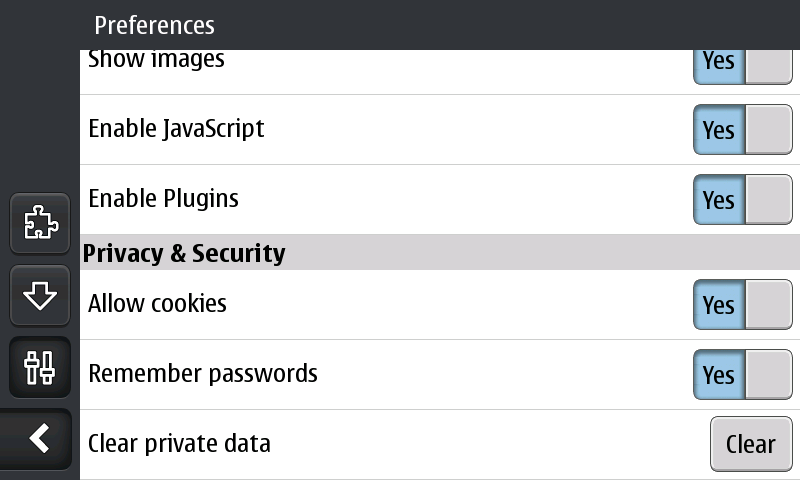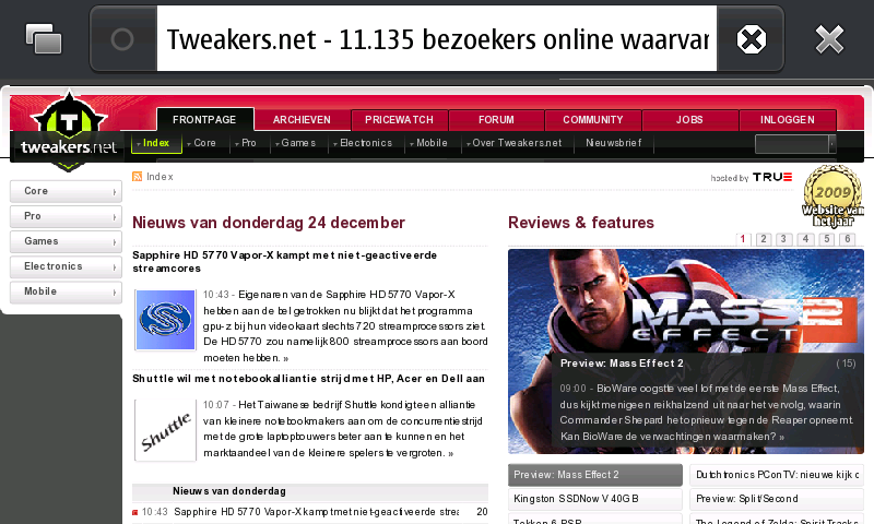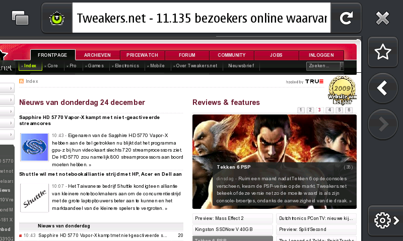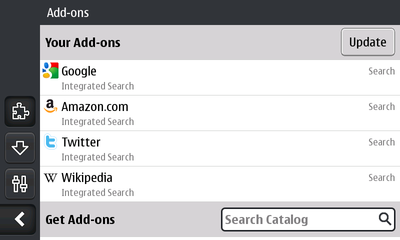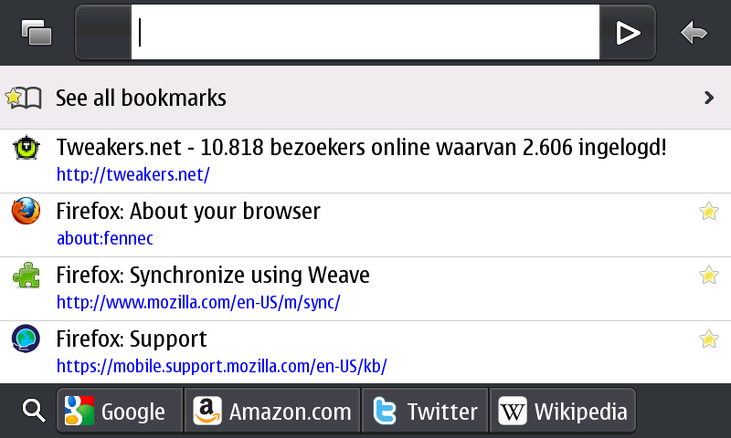 Firefox voor de N900 is net als de desktopversie uitgerust met de awesomebar. Daarnaast dient de adresbalk ook als zoekvenster. Met een klik onderin het scherm kan vervolgens op Google, Amazon, Twitter en Wikipedia gezocht worden.