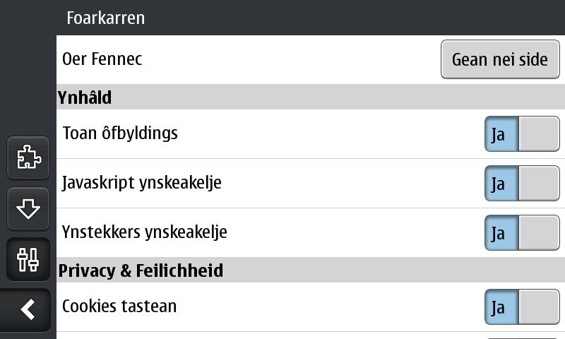 De browser heet in het menu al 'Firefox' in plaats van 'Fennec'. De interface is gebaseerd op 'gestures' of gebaren: door naar rechts te vegen komt links van de internetpagina een sidebar tevoorschijn met openstaande vensters en de mogelijkheid nieuwe vensters te openen. Door naar links te vegen komt een menu tevoorschijn waarin instellingen en add-ons ingesteld kunnen worden.