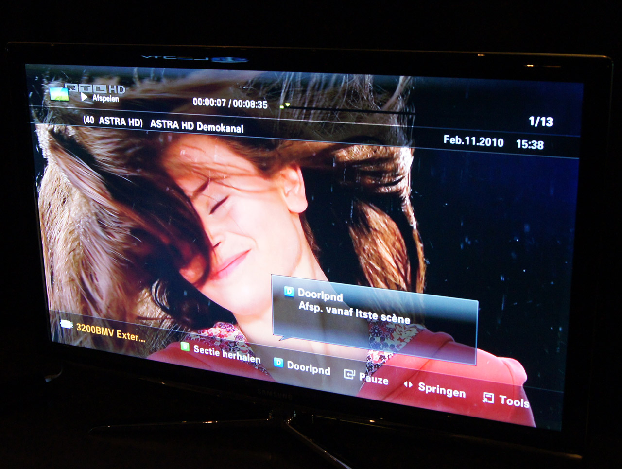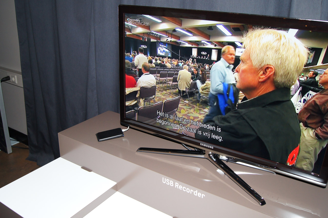 Op het persevent in Loosdrecht, waarbij ook een samenwerking met de bekende vormgever Eric Kuster werd aangekondigd, demonstreerde Samsung aan Tweakers.net voor het eerst ook de pvr-functionaliteit. Met een druk op de rode opnameknop linksonder op de afstandsbediening kan direct het bekeken kanaal worden opgenomen en ook bovenin het beeld wordt dit icoontje weergegeven ten teken dat er iets wordt opgenomen.
