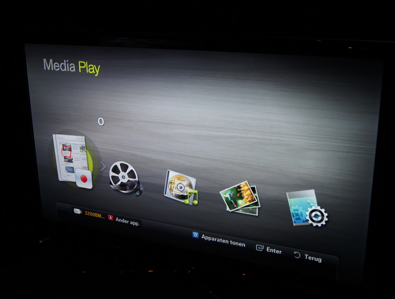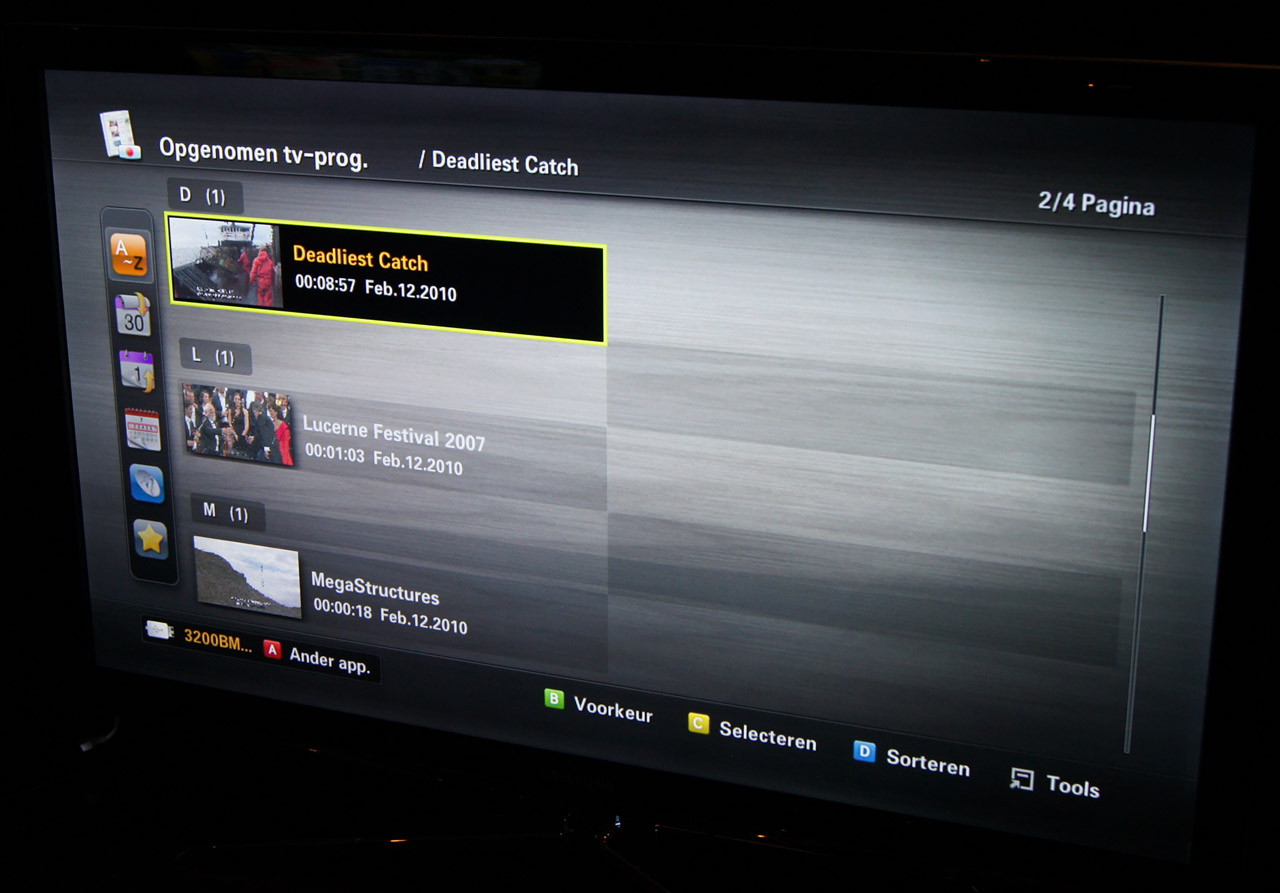 De opgenomen beelden zijn terug te vinden in de Media Play-sectie, waarvoor op de afstandsbediening ook een knop is ingericht. Het videomateriaal is alfabetisch te doorzoeken op programmanaam, maar er kan ook op datum en op favorieten worden gezocht. Ook zagen we in het pvr-menu een icoon met een schotelantenne, mogelijk bedoeld voor opnames van uitzendingen via de satelliet. De video wordt in de uitgezonden kwaliteit opgenomen.