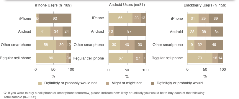 Gebruikers van een iPhone of Android-toestel zijn volgens het onderzoek van Crowd Science het loyaalst: 92 procent van de iPhone-gebruikers geeft aan trouw te blijven aan Apple, terwijl 87 procent van de Android-gebruikers aangeeft bij Googles mobiele besturingssysteem te willen blijven. Bijna alle gebruikers van de iPhone zouden anderen aanraden om de smartphone van Apple te kopen en alle ondervraagde Android-gebruikers zouden Googles mobiele OS aan anderen aanraden.