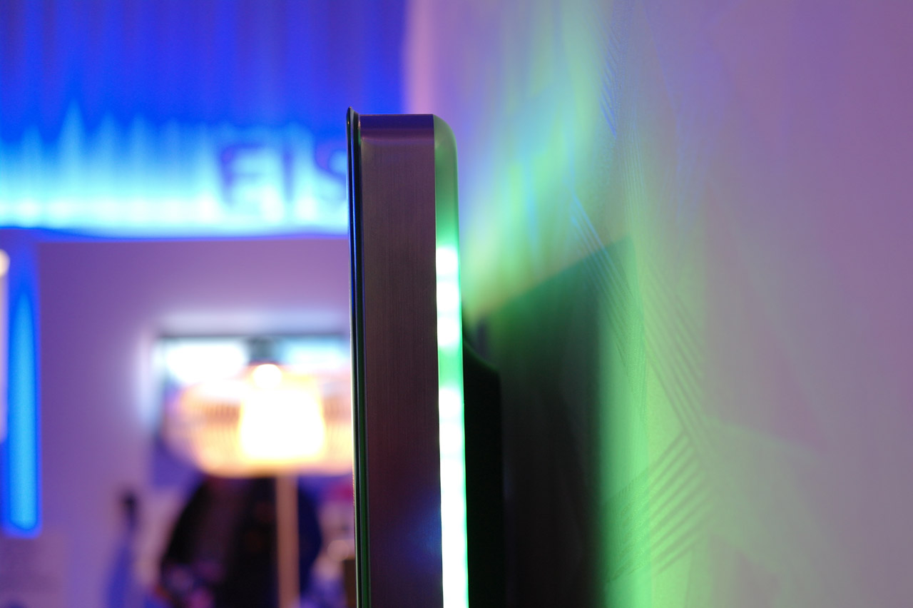De brede 3d-tv heeft ook de 2-in-1-standaard van de 9705H en de 8605H gekregen. Dit betekent dat de voet naar achteren kan worden geklapt en dan dienst doet als muurbeugel. De bezel van de 3d-Cinema 21:9 is van zwart metaal en aan de achterkant zitten aan drie zijden de led-strips voor Ambilight Spectra 3.
