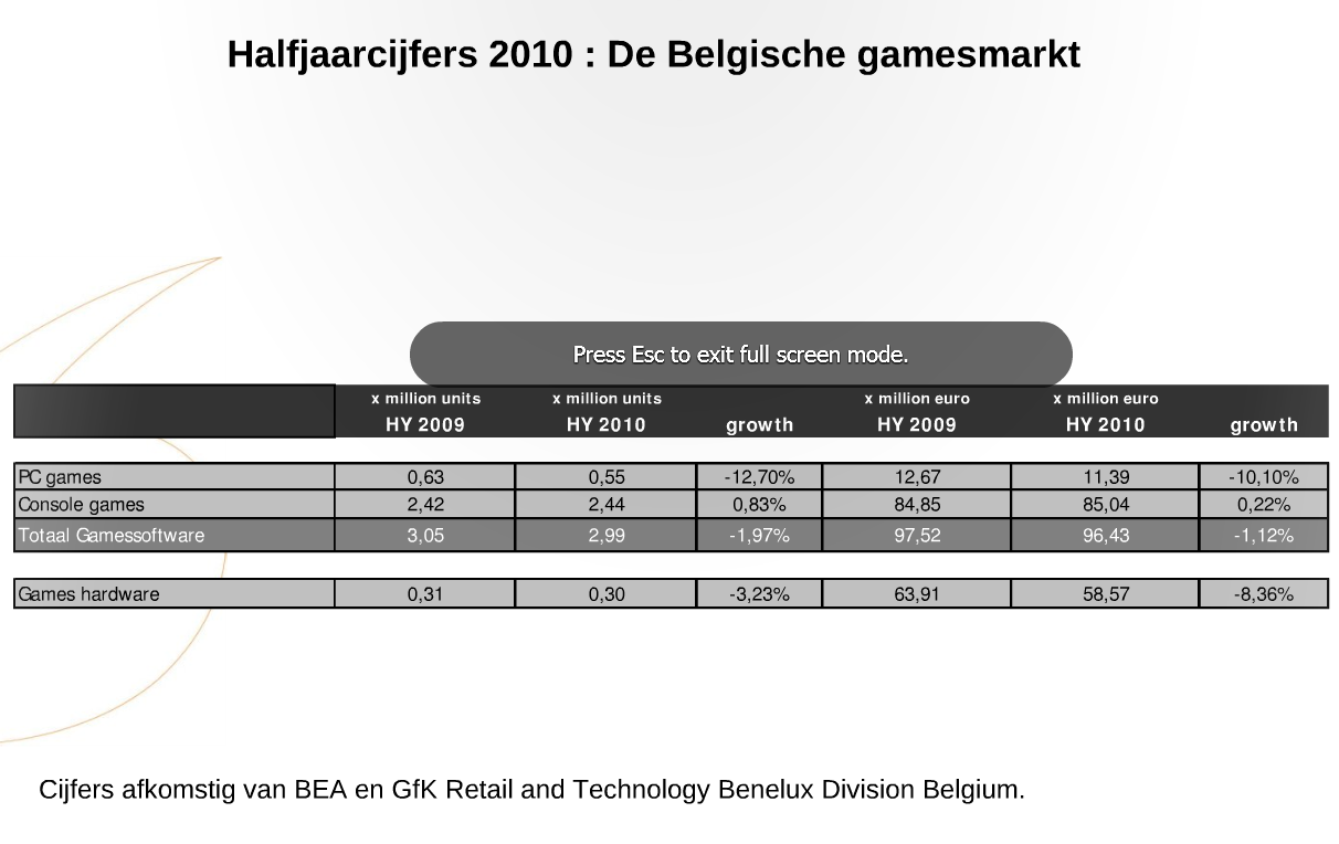 De totale hoeveelheid in België verkochte games nam in het eerste halfjaar van 2010 af met 3,23 procent, terwijl de opbrengst met 8,36 procent terugliep. De terugval is echter volledig terug te voeren op de afname in gameverkopen voor de pc, volgens de cijfers van de BEA en marktonderzoeksbureau GfK. De verkoop van consolegames zou namelijk weer iets in de lift zitten; de hoeveelheid verkochte consolegames nam met 0,883 procent toe en de opbrengst hieruit steeg met 0,22 procent.