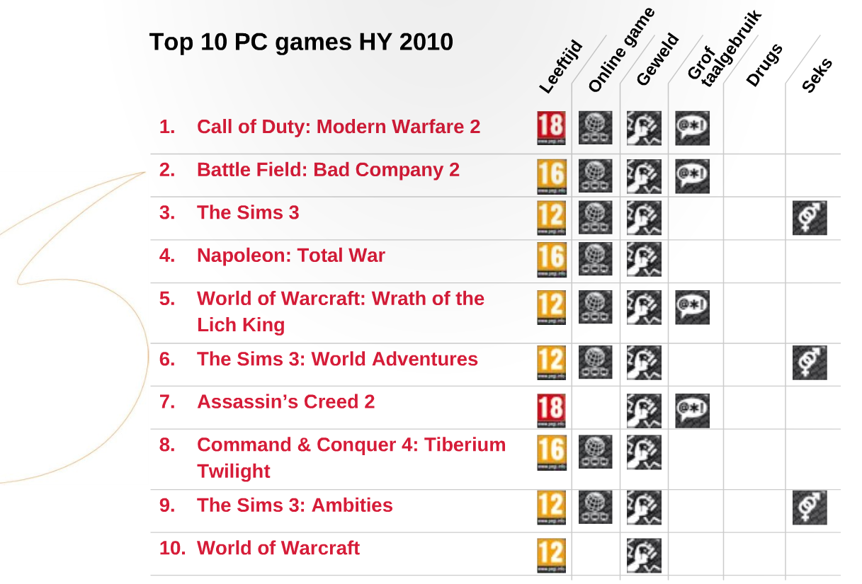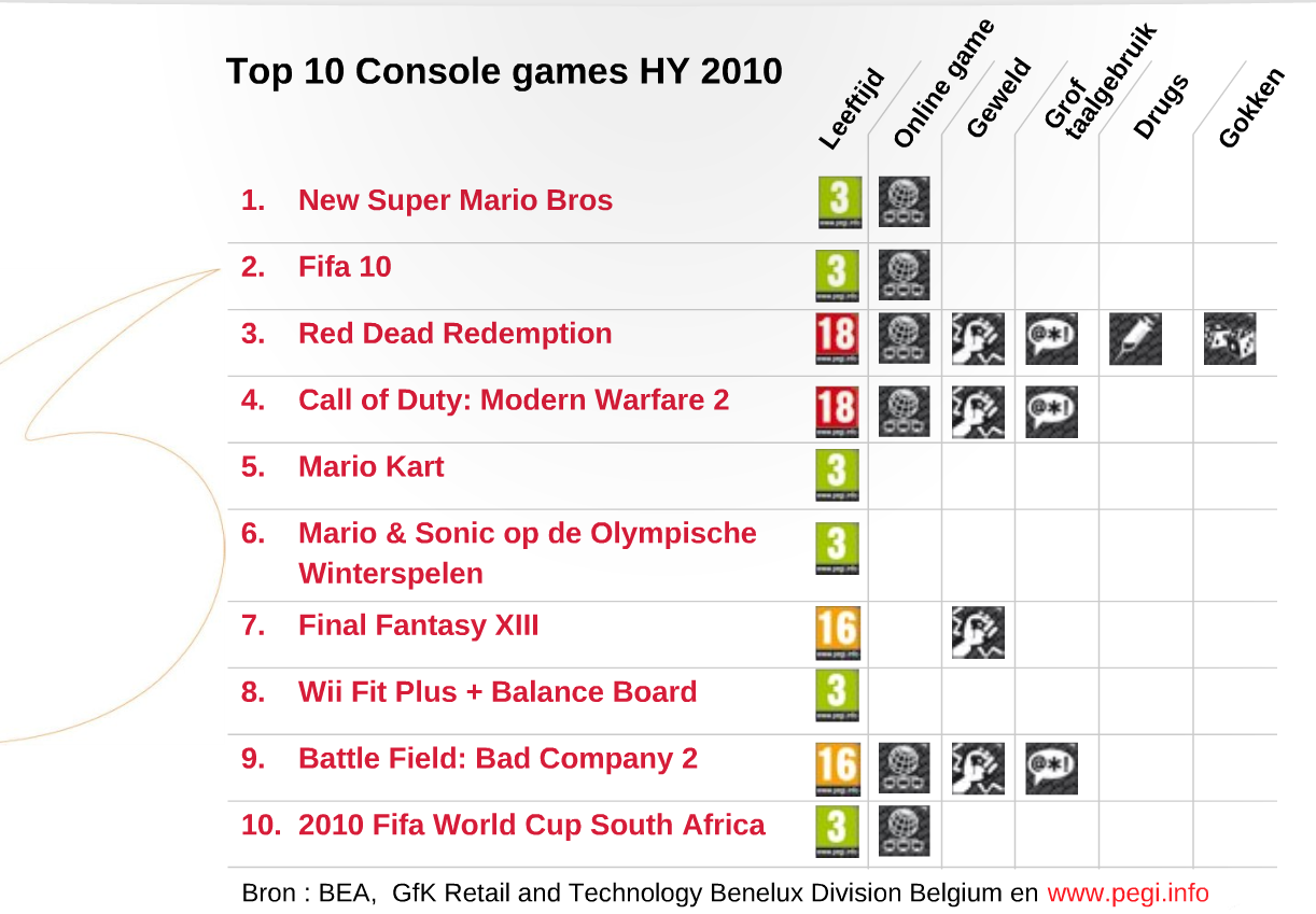 De populairste consolegames in België zijn Super Mario Bros, FIFA 10 en Red Dead Redemption. De Nintendo DSi, de Nintendo Wii en de Sony PS3 waren de meest verkochte consoles. Call of Duty: Modern Warfare 2, Battlefield: Bad Company 2 en The Sims3 waren de populairste pc-titels in de eerste helft van 2010.