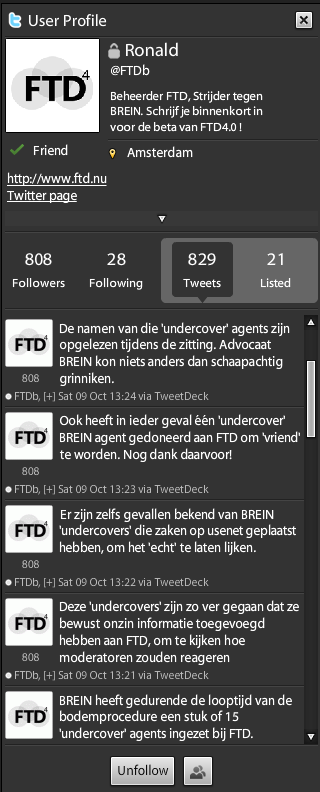 Auteursrechtorganisatie Brein heeft tijdens onderzoek naar usenetcommunity FTD vijftien mensen 'undercover' laten gaan, claimt de directeur van FTD. Deze mensen zouden zelfs content op Usenet hebben gezet om geloofwaardiger te lijken.