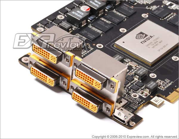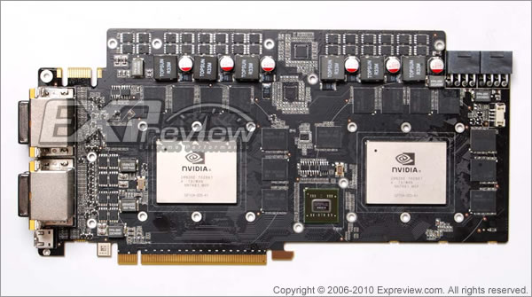 De twee gpu's werden op een pcb geplaatst dat niet langer, maar breder is dan gebruikelijk. De energievoorziening bestaat per gpu uit vier vrm's, die hun prik krijgen van twee pci-e-connectors met elk acht pinnen. Daarmee kan het verbruik in theorie tot 375W stijgen, maar een verbruik van rond de 300W is realistischer. De twee gpu's worden door een NF200-chip met elkaar verbonden, zoals gebruikelijk met dual-gpu videokaarten van Nvidia. De foto's tonen geen koeling, omdat nog niet vaststaat welke koeler zal worden gebruikt.