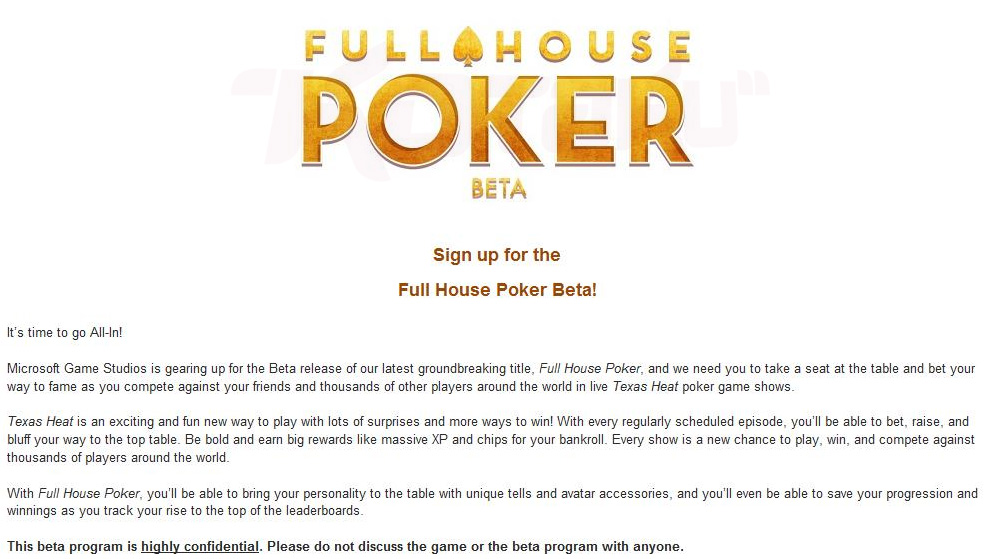 Microsoft heeft uitnodigingen verstuurd voor de bètatest van het tot nu toe onbekende Full House Poker. Daarin kunnen spelers via Xbox Live potjes poker spelen tegen andere leden van de onlinedienst van Microsoft.