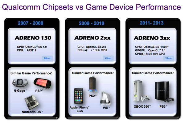 De volgende generatie Snapdragon-soc's van Qualcomm zal worden gebakken op 28nm, in plaats van de huidige 45nm. De nieuwe Snapdragon heeft een Adreno 300-gpu, die vergelijkbare grafische capaciteiten zou hebben als de PS3.