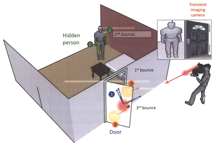 De camera die de medewerkers van het Massachusetts Institute of Technology onder leiding van professor Ramesh Raskar ontwikkelden, maakt gebruik van lasers. De zeer korte pulsen van de femtoseconde-laser reflecteren tegen deuren, spiegels en andere objecten en worden weer opgevangen door de camera-sensor. Door steeds pulsen te verzenden en de tijd en afstand tussen zenden en ontvangen te meten, kunnen beelden middels een algoritme gereconstrueerd worden.