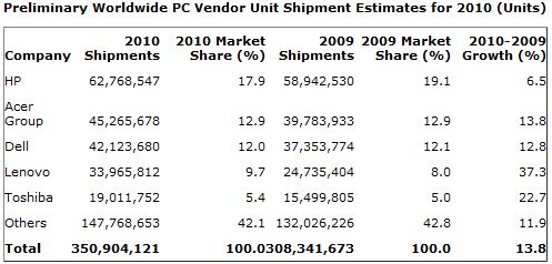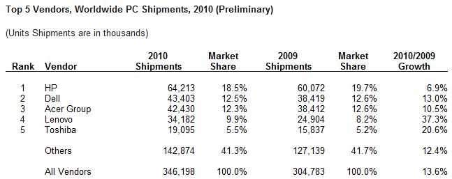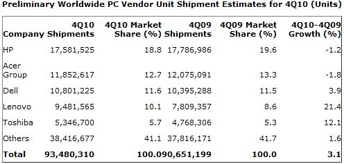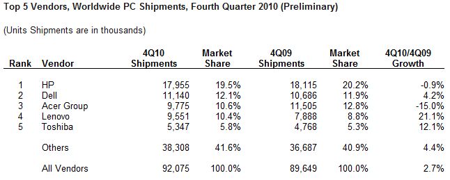 In het vierde kwartaal van 2010 werden er volgens Gartner 93,5 miljoen pc's verkocht, tegenover 90,7 miljoen in het vierde kwartaal van 2009. Daarmee zou de verkoop met 3,1 procent zijn toegenomen. IDC is iets conservatiever en claimt een groei van 2,7 procent ten opzichte van het vierde kwartaal in 2009. Volgens beide analisten is HP veruit de grootste fabrikant. Dell en Acer wisselen elkaar af op de tweede en derde plek wat de meeste verkopen in het vierde kwartaal van 2010 betreft. Asus verdween uit het rijtje van de vijf grootste fabrikanten.
