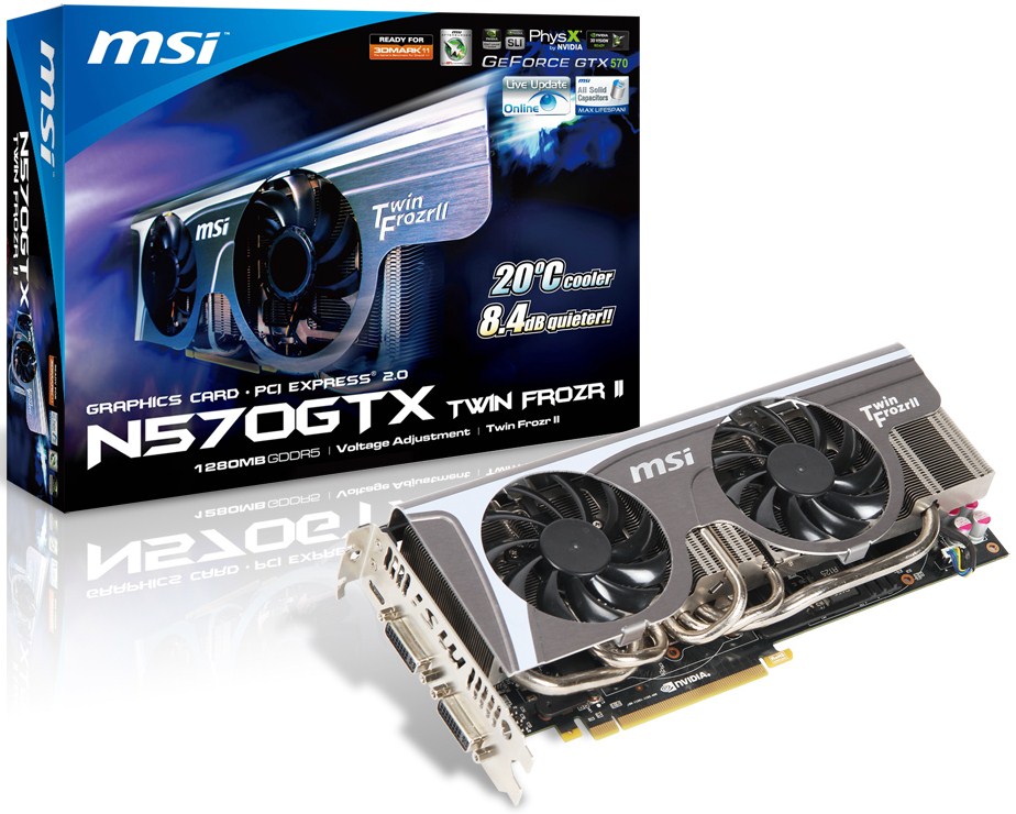MSI rust zowel de GTX 570 als de GTX 580 uit met de Twin Frozr II-koeler. De koeler zou de gpu's tot wel 20°C koeler houden, terwijl de geluidsproductie 8,4dBA lager ligt. De 8mm dikke heatpipes voeren de warmte af naar de aluminium vinnen, die ook het geheugen en de vrm's zouden bedekken. In hoeverre die componenten echter ook daadwerkelijk worden gekoeld is niet duidelijk. Om overklokkers tegemoet te komen, zitten er ook drie spanningsmeetpunten op de videokaart. MSI liet de kloksnelheden wel ongemoeid.