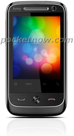Bij de derde telefoon is eveneens een opvallend design-element te zien: HTC heeft ervoor gekozen om toetsen voor het opnemen en ophangen van een telefoongesprek hardwarematig in te bouwen. Daarnaast is er een optisch trackpad te zien, en duikt ook de mogelijke frontcamera weer op.
