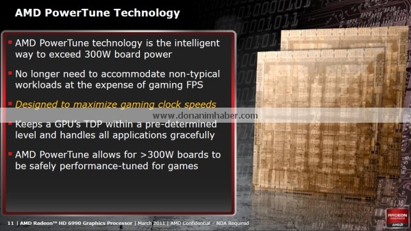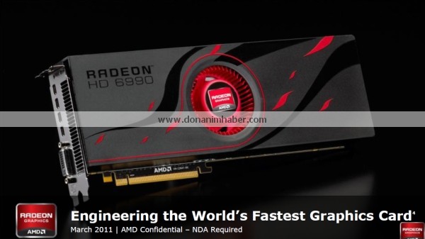 De website DonanimHaber publiceerde een groot deel van AMD's perspresentatie, die praktisch alle relevante informatie bevat; de slides lijken echt. De HD 6990 is opgebouwd uit twee Cayman-gpu's, zoals die ook voor de HD 6970 worden gebruikt. Dat betekent dat alle 1536 streamprocessors zijn geactiveerd. Samen zijn ze dus goed voor 3072 streamprocessors, nog altijd minder dan de 3200 streamprocessors van de HD 5970, maar door de nieuwe architectuur moet de HD 6990 ruimschoots sneller zijn.