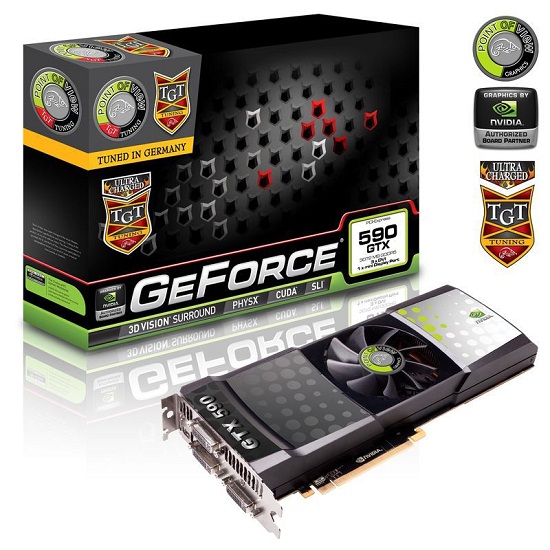 Nadat Nvidia op donderdag de GTX 590 officieel het levenslicht liet zien, zijn het nu de andere fabrikanten die hun visie op de GTX 590 uitbrengen. De meest opvallende GTX 590's zijn afkomstig van EVGA en Point of View. EVGA brengt zowel een GTX 590 met de normale koeler uit, als een met een voorgeïnstalleerd full-cover-waterblok. Beide GTX 590's zijn overgeklokt van 607 naar 630MHz, terwijl het geheugen op 3456 in plaats van 3414MHz tikt. De luchtgekoelde en de watergekoelde variant kosten respectievelijk 730 en 880 dollar.