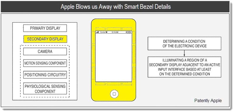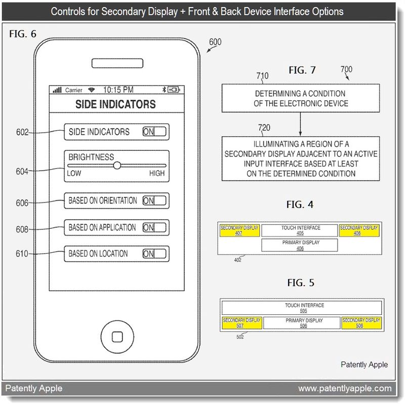 Een ander patent spreekt van de randen rondom om het scherm als secundair scherm, waarin bijvoorbeeld bedieningsknoppen kunnen worden weergegeven. HTC doet ongeveer hetzelfde met zijn tablet Flyer, waar de voor Android benodigde knoppen op een andere plek met ledjes worden weergegeven als het scherm wordt gedraaid.