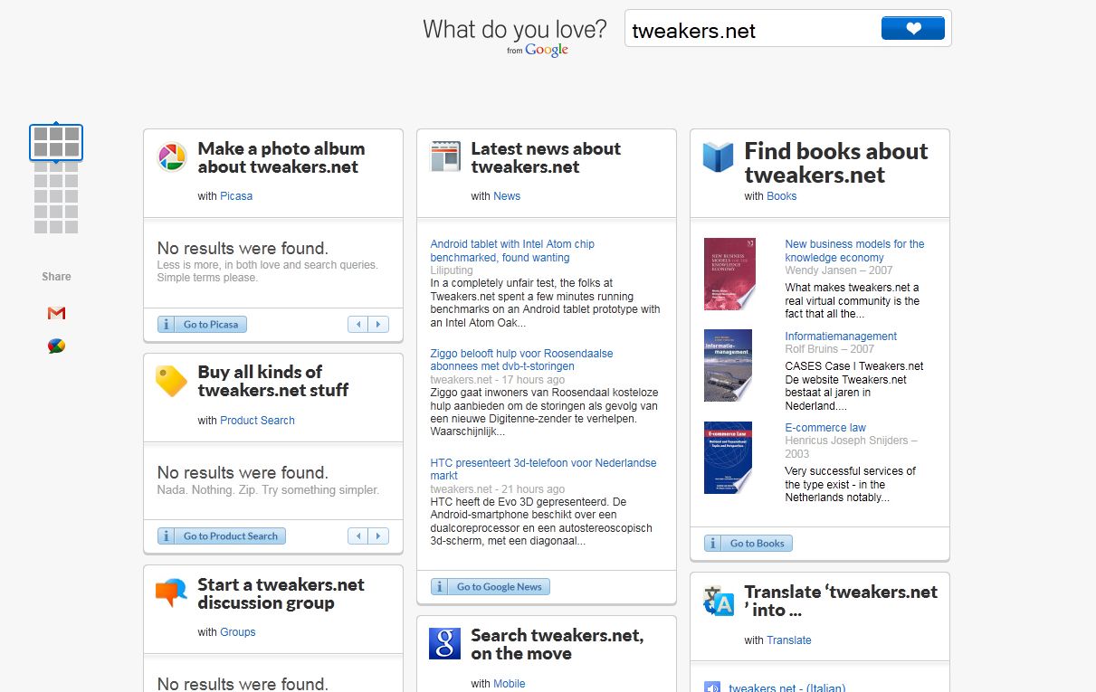 Google is een portaal aan het testen waarop diversen van zijn diensten samenkomen. De pagina heet 'What do you love?' en groepeert zoekresultaten naar diensten in blokken, zoals YouTube, Google Earth en Google Patent Search.