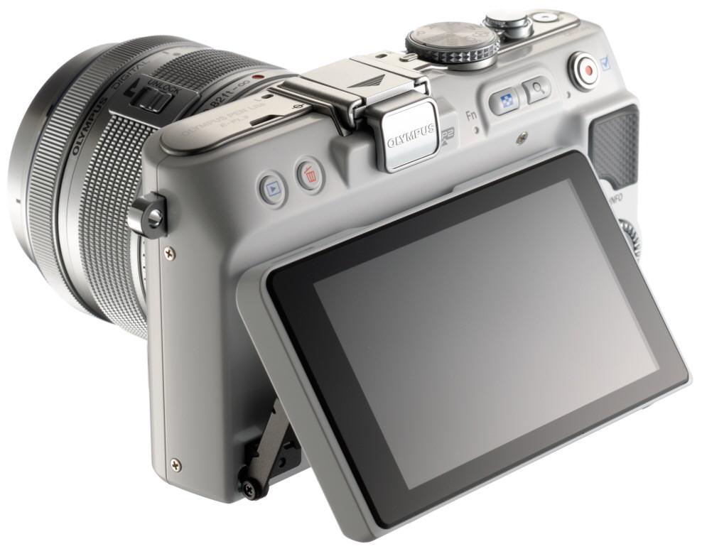 De kleinste variant is de E-PM1 en deze lijkt in veel opzichten op een afslankte PL3. Ook deze camera wordt geleverd met een externe flitser.