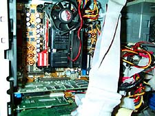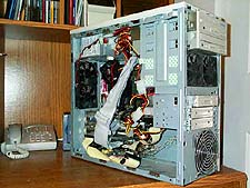 After doing some more tweaking and the addition of a better cooling setup for the heatsink this bad boy is now humming along at 901 Mhz! To finally break the 900 barrier took an additional .5 volts to keep the processor stable. Here is a description and picture of a better cooling solution for my Athlon. In the pictures below I was using a YS Tech 60mm and a small fan from a Pentium II heatsink. What I decided to do was replace the 60mm with a 80mm and remove the small Pentium II fan and place the 60mm on the side of the heatsink. This increased the amount of air flow through the fins on the heatsink itself. Below are some more pictures of case and processor.