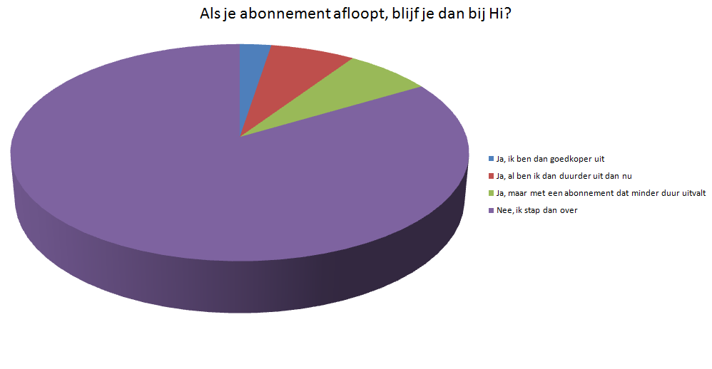 De interesse om over te stappen is onder klanten van KPN en Hi even groot: 84 procent. De massale overstap zal nog wel op zich laten wachten; de meeste mensen kunnen in de komende zes maanden nog niet van hun abonnement af.