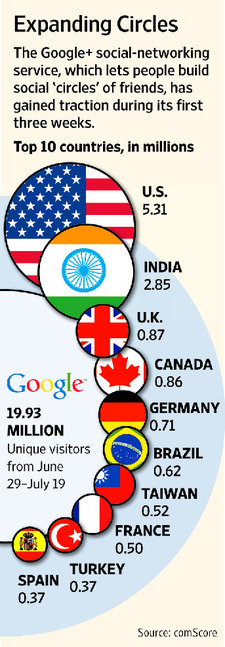 Het onderzoek, waarin The Wall Street Journal inzage heeft gekregen, is afkomstig van marktonderzoeksbureau Comscore. Google wilde de cijfers niet bevestigen. Van de 20 miljoen gebruikers komen er meer dan 5 miljoen uit de Verenigde Staten. Nederland komt niet voor in de top 10 van landen met de meeste gebruikers. Dat Google in korte tijd zo veel gebruikers heeft weten aan te trekken, is opvallend, omdat gebruikers een uitnodiging van een bestaand lid nodig hebben om binnen te komen.