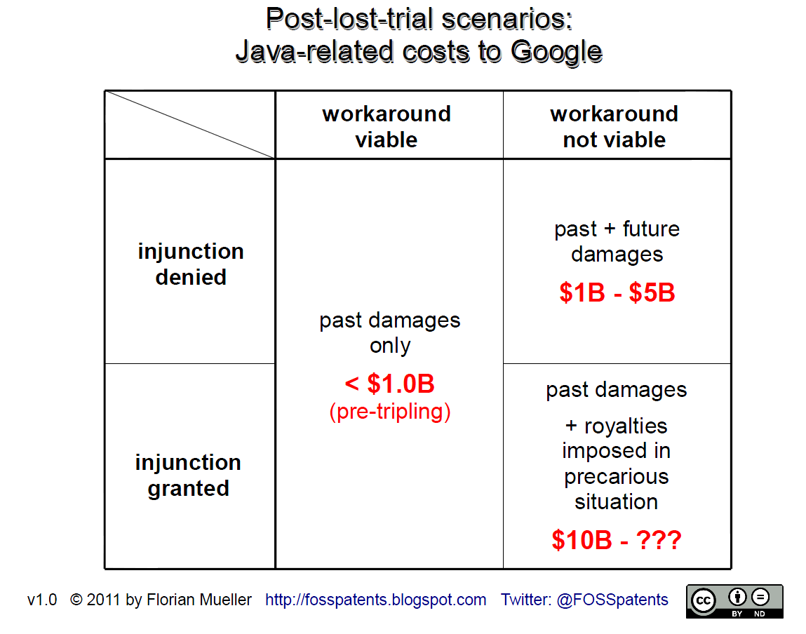 Oracle claimt dat de schade door copyrightinbreuken 136 miljoen dollar en die door patentinbreuken 202 miljoen dollar bedraagt. Uit een document dat het concern indiende bij de rechtbank van San Francisco, blijkt bovendien dat Oracle meent dat Google 824 miljoen dollar heeft weten op te strijken met de auteursrechteninbreuk.