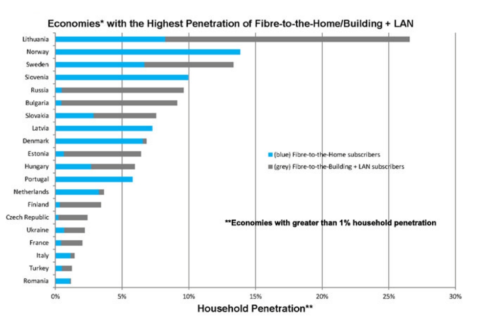Nederland staat met een penetratie van iets meer dan 3 procent op de dertiende plaats, drie plaatsen lager dan vorig jaar. In 2009 stond Nederland nog op de achtste plaats. "De reden dat veel Oost-Europese landen sneller een hogere penetratie hebben, is dat ze hiervoor simpelweg nog niets hadden. Het is logisch dat ze daarom meteen voor het snelle glasvezel kiezen in plaats van koper", stelt woordvoerder Sally van den Bemden van de FTTH Council.