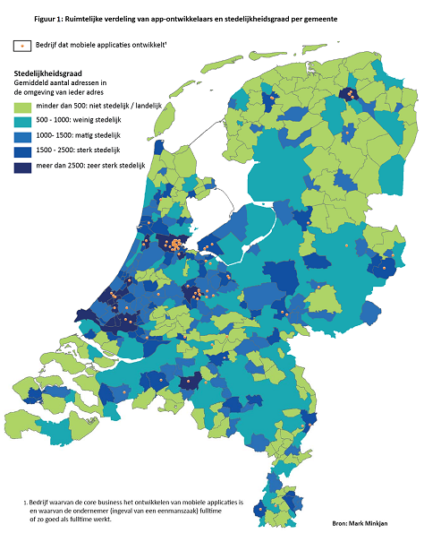 De app-ontwikkelaars zitten ook hoofdzakelijk in de Randstad, met Amsterdam als hotspot; ruim een derde van de ontwikkelaars bleek daar te werken. Minkjan noemt dat opvallend, omdat de werkzaamheden niet vereisen dat ze op een bepaalde plek werken. De app-ontwikkelaars bleken bijna allemaal in steden te zitten; op het platteland bleek nauwelijks een ontwikkelaar van apps te vinden.
