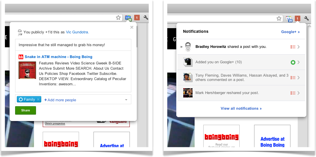 Twee nieuwe extensies voor Chrome kunnen gebruikt worden om een bezochte webpagina direct op Google+ te delen met een +1-knop, en om notificaties van het sociale netwerk te tonen. Dezelfde functionaliteit komt beschikbaar in een Google+-toolbar voor Internet Explorer.