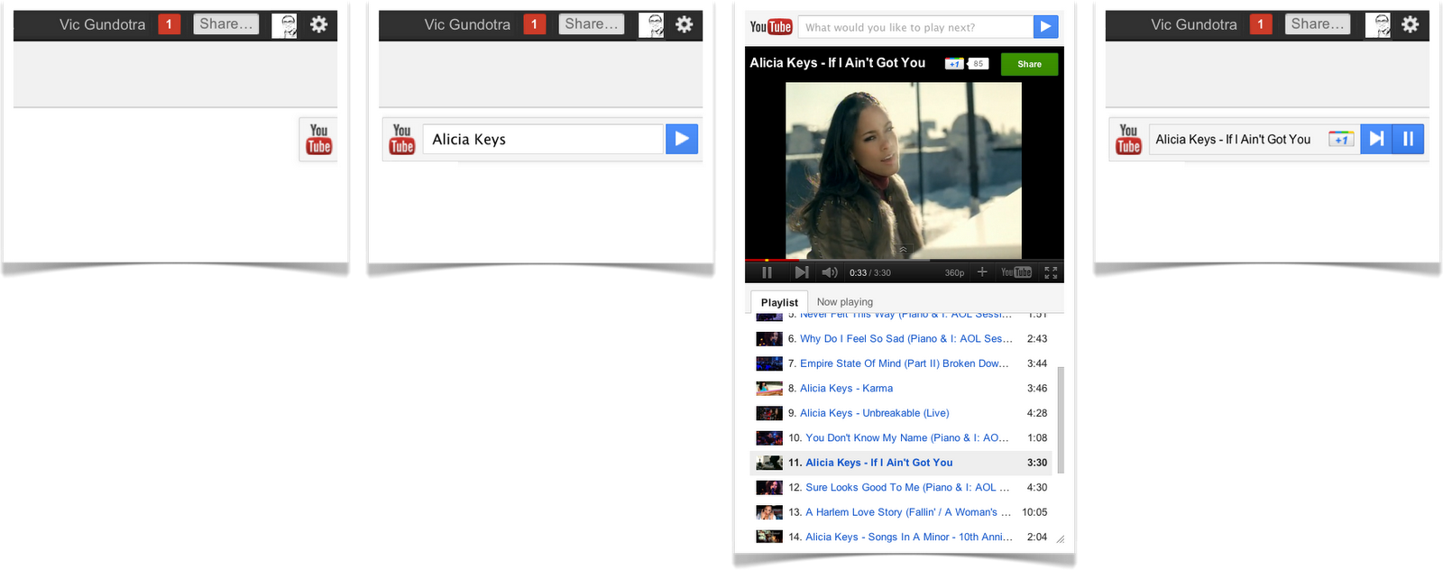 Door het drukken op de Youtube-knop aan de rechterkant van de Google+-site komt er een slider naar buiten waarmee gebruikers na een zoekactie video's af kunnen spelen. Daarbij kunnen Youtube-video's direct met contactpersonen binnen Google+ worden gedeeld: zij krijgen vervolgens de mogelijkheid om op basis van de gedeelde video een relevante playlist af te laten spelen. Tevens zijn Youtube-playlists met de zoekfunctie te vinden.