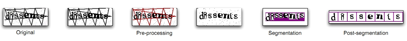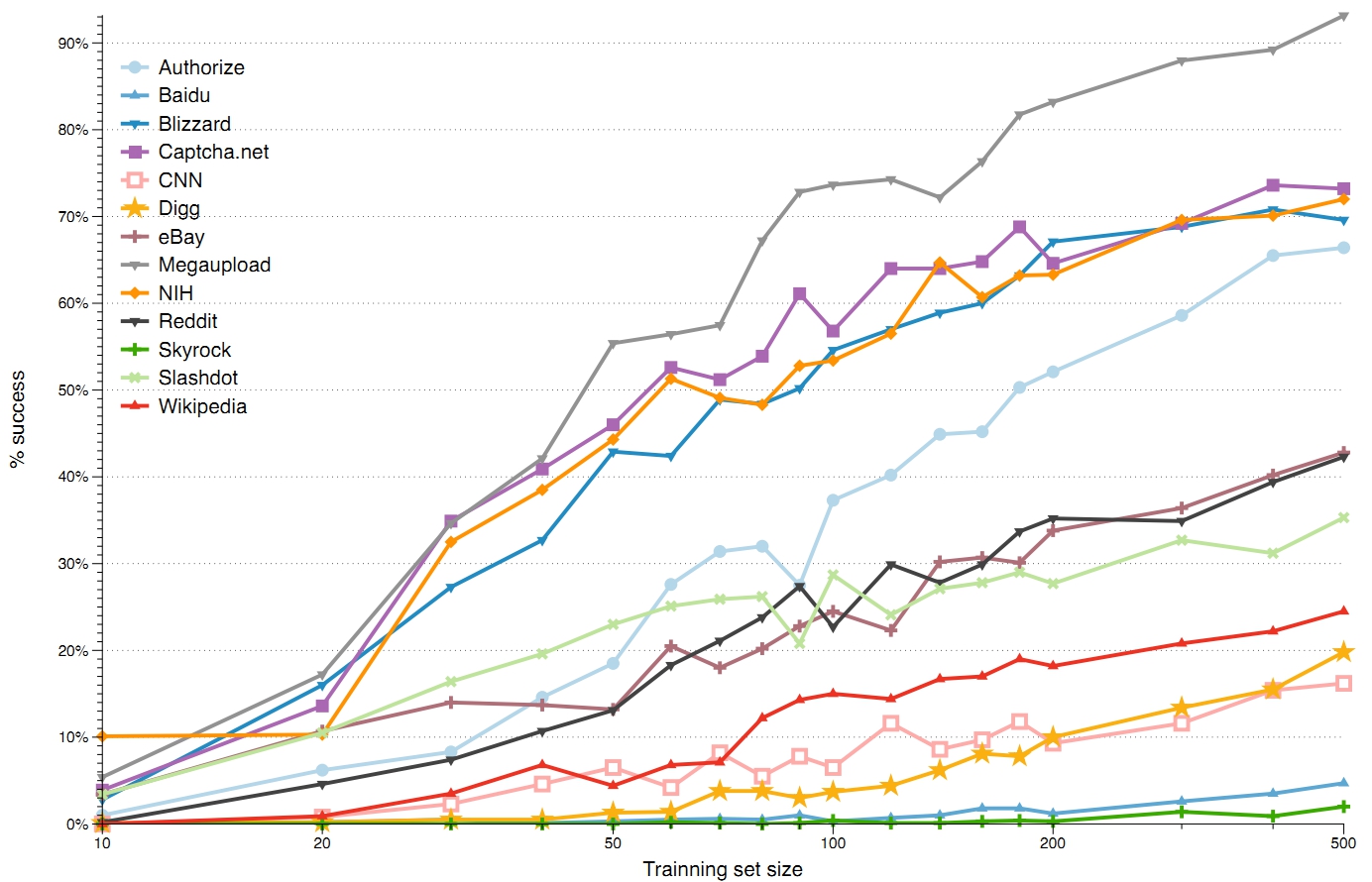 De onderzoekers probeerden hun software uit op verschillende grote sites, met diverse soorten captcha's. Grote sites als eBay, Wikipedia, CNN, Baidu, Digg en Visa's Authorize.net bleken te omzeilen. Van de vijftien geteste captcha's bleven alleen die van Google en Recaptcha redelijk buiten de gevarenzone. Hun captcha's konden onder andere minder vaak gekraakt worden omdat de gebruikte methodes het moeilijker maakten het aantal en de gemiddelde grootte van de tekens te bepalen.