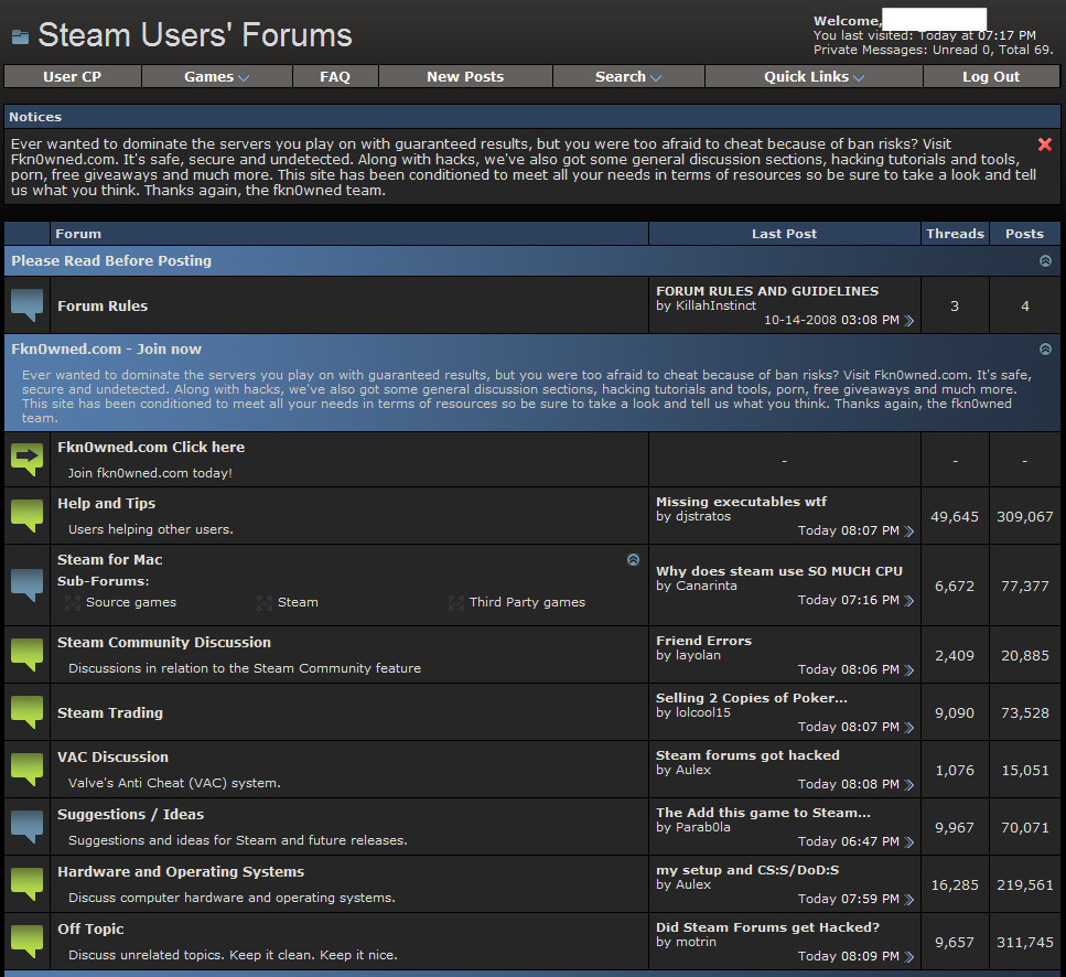 Het officiële gebruikersforum van Steam is offline. Valve meldt op de site dat het om onderhoud gaat, maar op het internet circuleren berichten dat het om een hack van Fkn0wned.com gaat. De site voor gamingcheats ontkent betrokken te zijn.