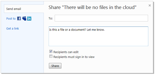In de vernieuwde Skydrive-dienst is ook de integratie met sociale netwerken onder handen genomen. Gebruikers kunnen nu documenten delen met contacten uit verschillende diensten, waaronder LinkedIn, Facebook en Gmail, schrijft Microsoft. Zij krijgen daarbij de optie om de ontvangers de documenten alleen te laten lezen of ook te laten bewerken.