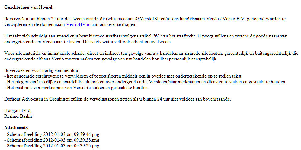 "U maakt zich schuldig aan smaad en u bent hiermee strafbaar volgens artikel 261 van het strafrecht", schrijft de ceo van Versio, Reshad Bashir, in de mail. Het hostingbedrijf eist onder andere dat Robert van Hoesel de tweets rectificeert of verwijdert. Ook is het bedrijf niet blij met de domeinnaam VersioBV.nl die de klant uit wraak heeft geregistreerd.