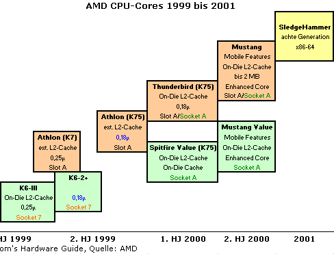 Via Ace's Hardware kwam ik bij dit AMD Roadmap artikel van Tomshardware.de. Volgens dit artikel zal de Spitfire (low-end Athlon) waarschijnlijk met 128 of 256Kb on-die L2 cache uitgerust worden. De Thunderbird (high-end Athlon) zal voorzien zijn van 256 tot 512Kb on-die L2 cache. Top model Mustang staat voor de tweede helft van 2000 gepland en krijgt een verbeterde core met maximaal 2Mb L2 cache, 266MHz frontside bus en support voor AGP Pro: