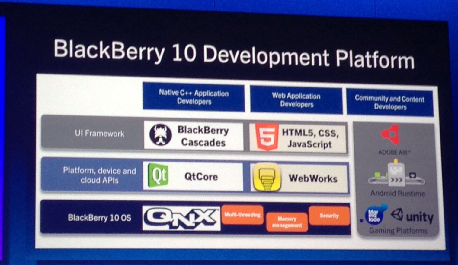 Onderaan de schermen zijn drie knoppen zichtbaar voor veelgebruikte functies: bellen, zoeken en foto's maken. Ook is er een plaatje van een nieuw belscherm. BlackBerry 10 is niet langer gebaseerd op Java, zoals alle voorgaande versies van BlackBerry OS. In plaats daarvan dient Neutrino OS, van het door RIM overgenomen QNX, als basis. RIM werkt al met een op QNX-gebaseerd systeem met BlackBerry Tablet OS, dat werkt op de PlayBook-tablet.