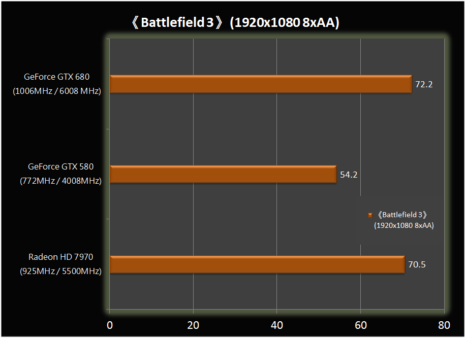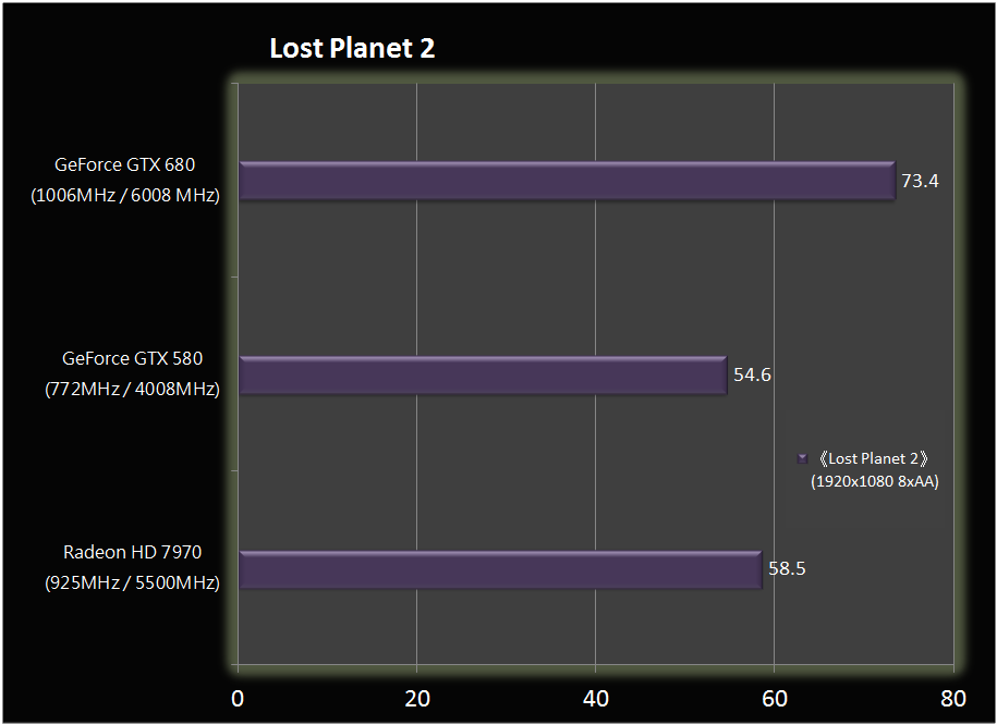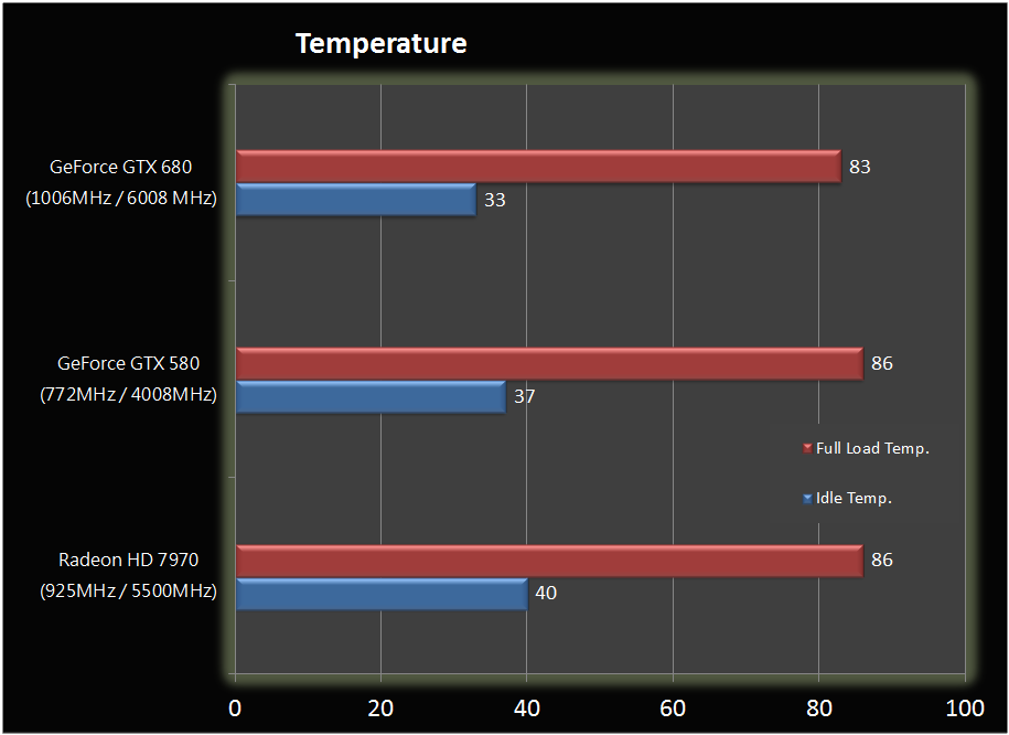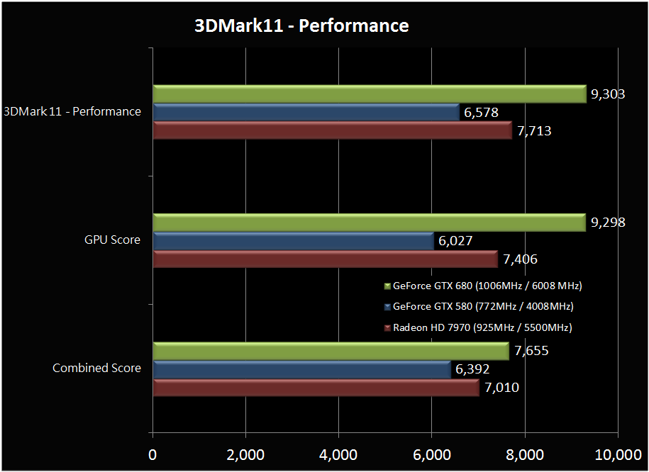 Ondanks de kleinere die-size en lagere tdp, scoort de GeForce-kaart bij veel benchmarks bij Hkepc beter, hoewel er nog maar weinig gamebenchmarks gedraaid werden. Bij 3DMark11, Heaven, Batman Arkham City en Lost Planet 2 scoort de kaart significant beter dan de HD 7970, maar sommige van deze benchmarks zijn ook echte Nvidia-benchmarks. Bij Battlefield 3 heeft de GeForce een lichte voorsprong en bij Call of Duty Modern Warfare 3 presteren de beide kemphanen identiek.