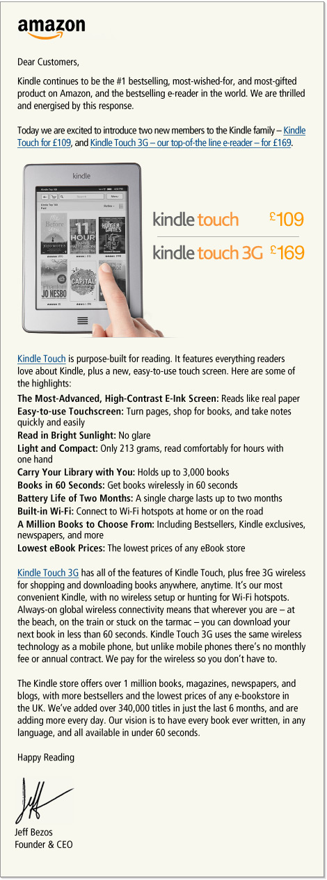De Kindle Touch kost bij de Duitse Amazon-site 129 euro, terwijl het nieuwe topmodel Kindle Touch 3G, met een 3g-verbinding zonder maandelijkse kosten, 189 euro kost. Amazon haalt de populaire Kindle Fire-tablet vooralsnog niet naar Europa.