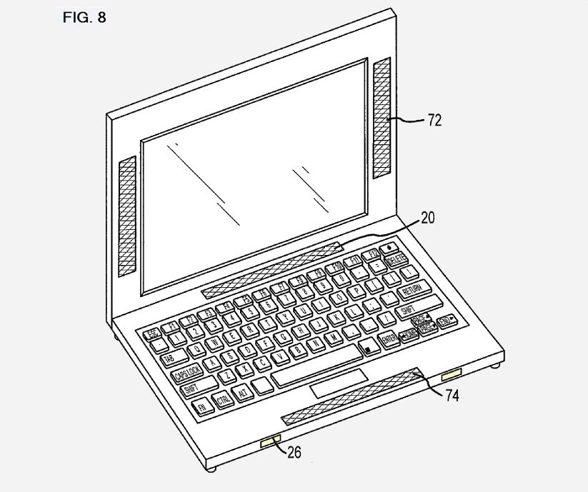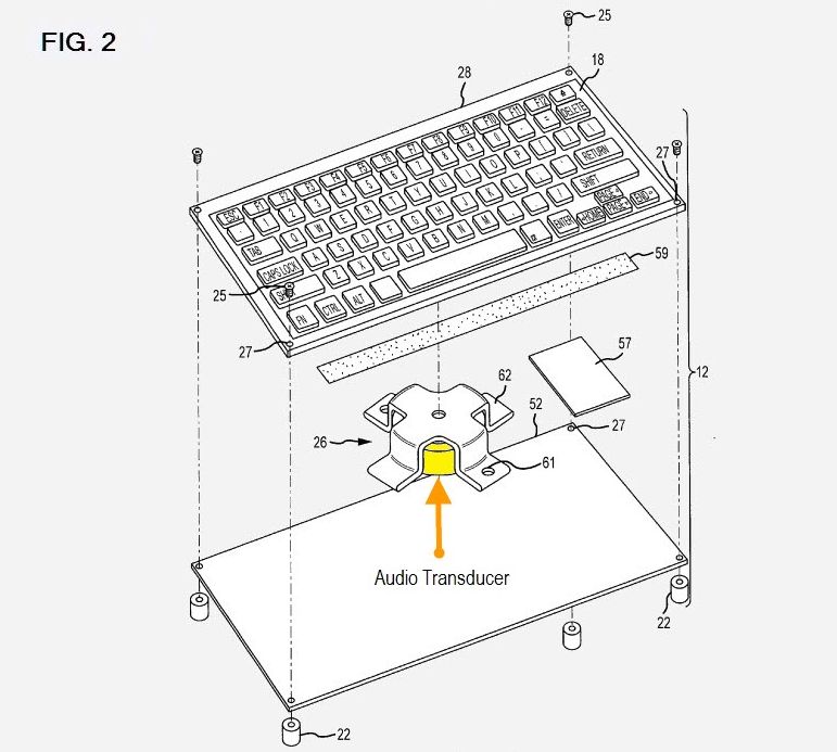 Het patent is in 2010 aangevraagd en recent gepubliceerd, bericht Patently Apple. De vinding draait om een oplossing voor het probleem dat er steeds minder ruimte voor speakers in kleine en dunne apparaten is, met de nadelige gevolgen voor de audiokwaliteit van dien. Apple denkt na over een centraal geplaatste transducer die niet alleen de weergave van lage frequenties van 20 tot 500Hz, maar ook de middenfrequenties van 500 tot 1500Hz voor zijn rekening kan nemen. Op de bij het patent gepubliceerde afbeelding is te zien dat de transducer in een behuizing onder het keyboard geplaatst wordt, die dan mogelijk als een soort klankkast dienstdoet.