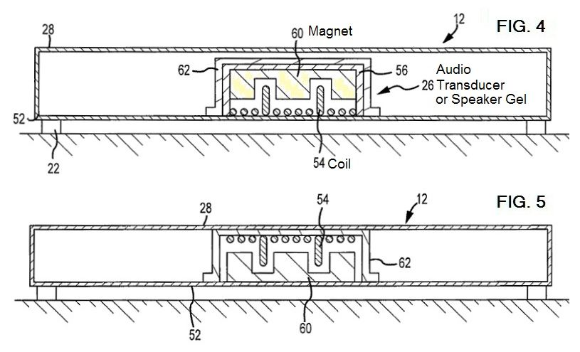 De transducer zou samen met kleine speakers in het scherm en voor en achter het keyboard voor de surround-weergave zorgen. De kleinere speakers geven daarbij de hogere frequenties weer, terwijl er ook een additionele subwoofer voor versterkte bas-weergave toegevoegd zou kunnen worden. Apple beschrijft daarnaast hoe de transducer met touch-input gecombineerd kan worden, zodat de audio-output versterkt wordt of afneemt als de gebruiker zijn hand over het oppervlak beweegt.