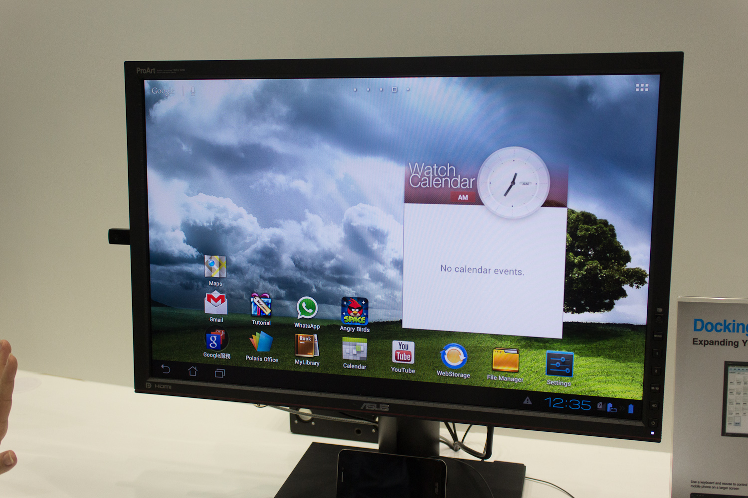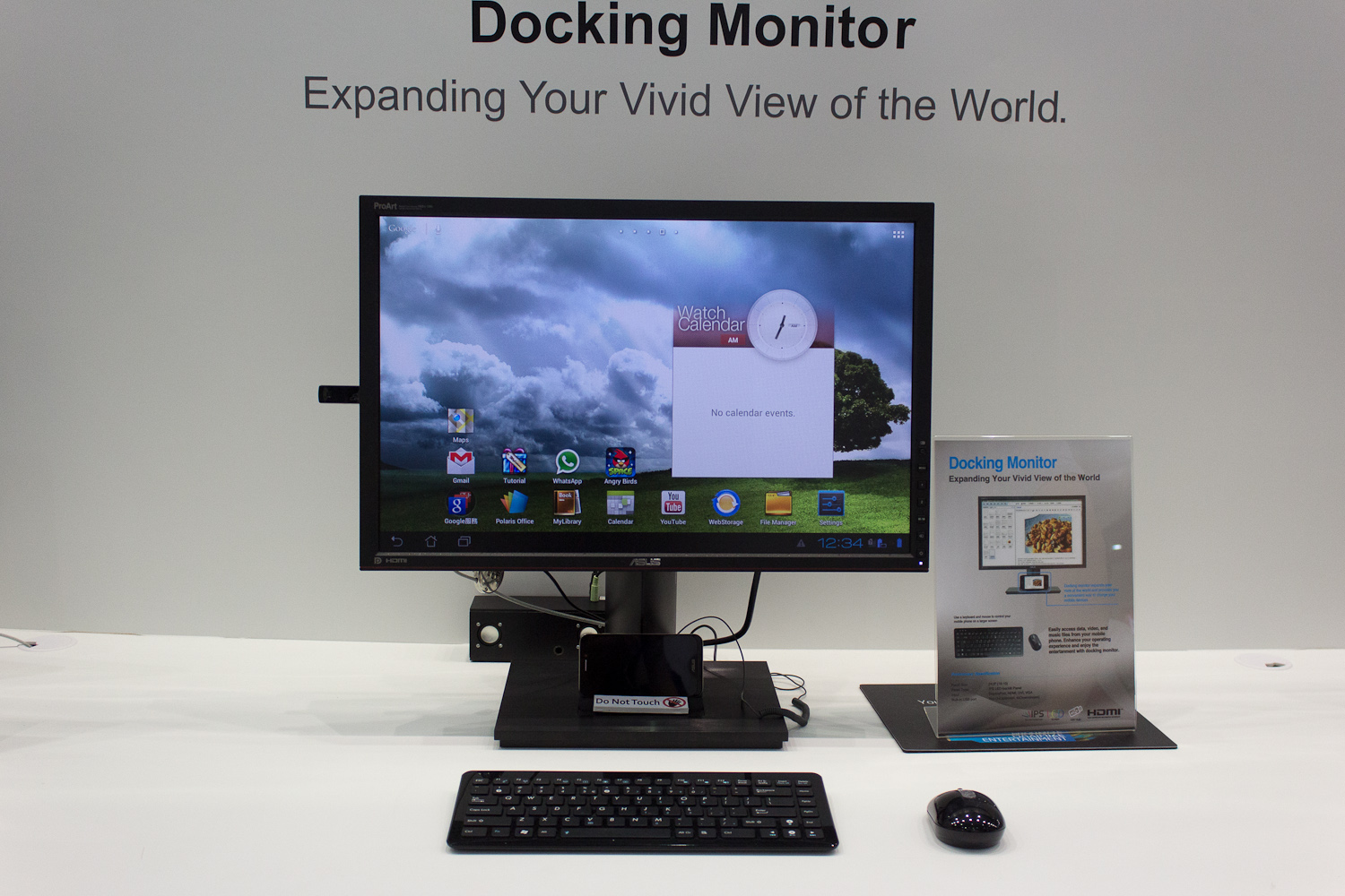 Asus toonde op zijn Computex-booth een 24"-beeldscherm uit zijn ProArt-lijn dat in de voet een dockingstation voor de PadFone heeft. Het scherm heeft vier usb-poorten ingebouwd, zodat toetsenbord en muis aangesloten kunnen worden.