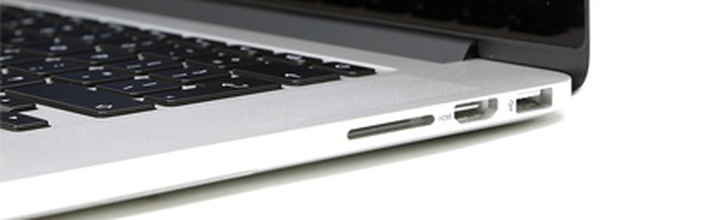 Apple heeft de high-end laptop uitgerust met twee usb 3.0-aansluitingen, een hdmi-uitgang en twee Thunderbolt-aansluitingen. Ook is een sd-kaartlezer aanwezig en in de behuizing zijn twee microfoons en een 720p-webcam verwerkt, evenals stereospeakers.