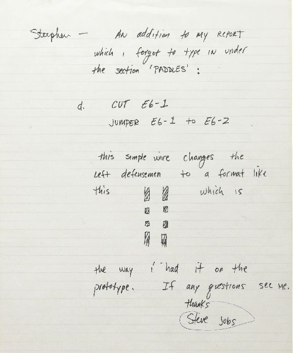 Naast de Apple I werd ook een memo van Steve Jobs uit 1974 geveild voor een bedrag van 27.500 dollar, omgerekend 21.761 euro. Het document beslaat vier pagina's en is geschreven in de tijd dat Jobs bij Atari werkzaam was. De toen negentienjarige Jobs beschrijft in de memo hoe het arcadespel World Cup verbeterd kan worden.